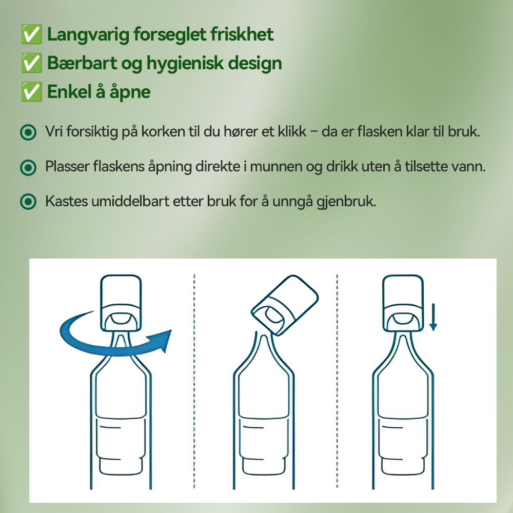 🍀 Tas én gang daglig, helst etter måltid. Drikkes direkte – ingen utblanding nødvendig.